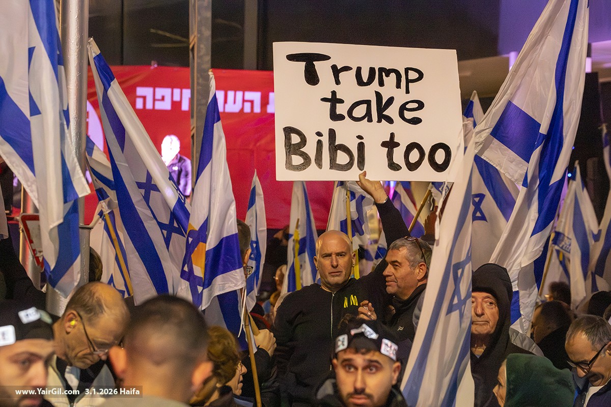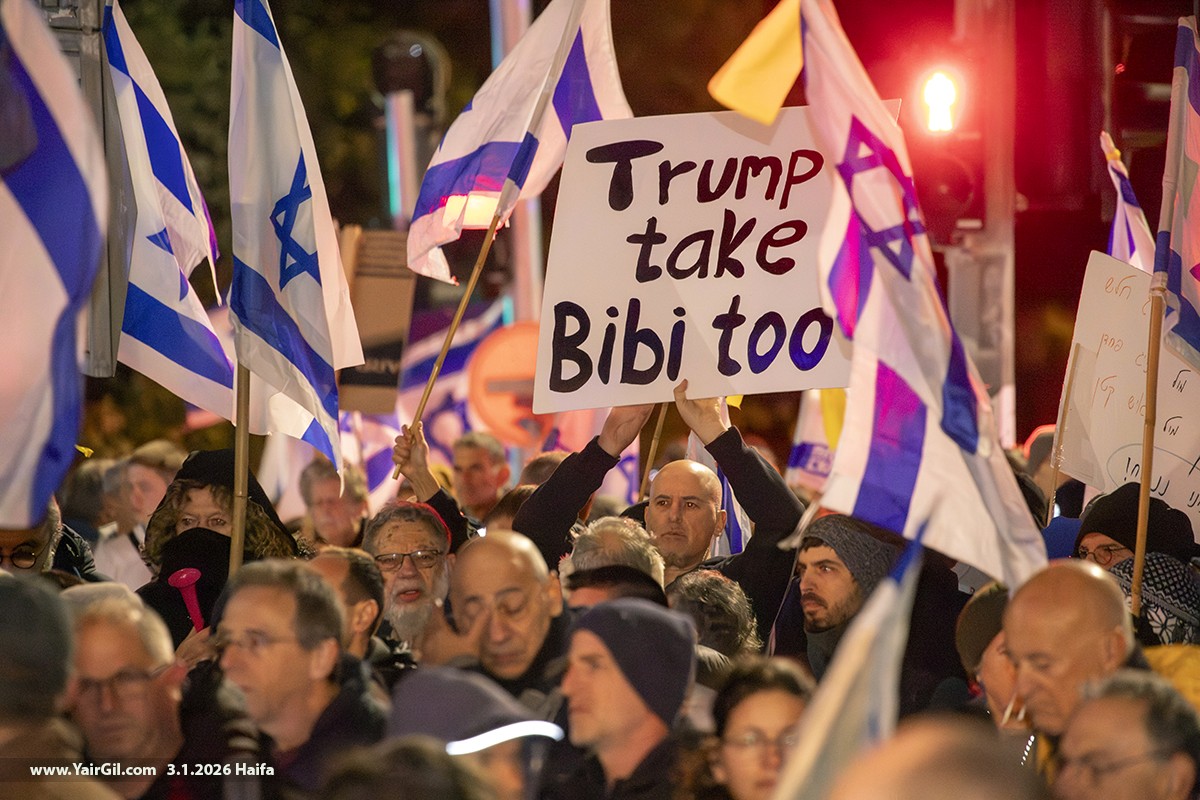 ההפגנה בחורב 3.1.2026 – נגד נתניהו וממשלתו, נגד ההפיכה המשטרית ובעד הקמת וועדת חקירה ממלכתית לאסון 710. – השלט Trump take Bibi too מרפרר לחטיפת נשיא ונצואלה ניקולס מדורו בידי צבא ארה"ב.