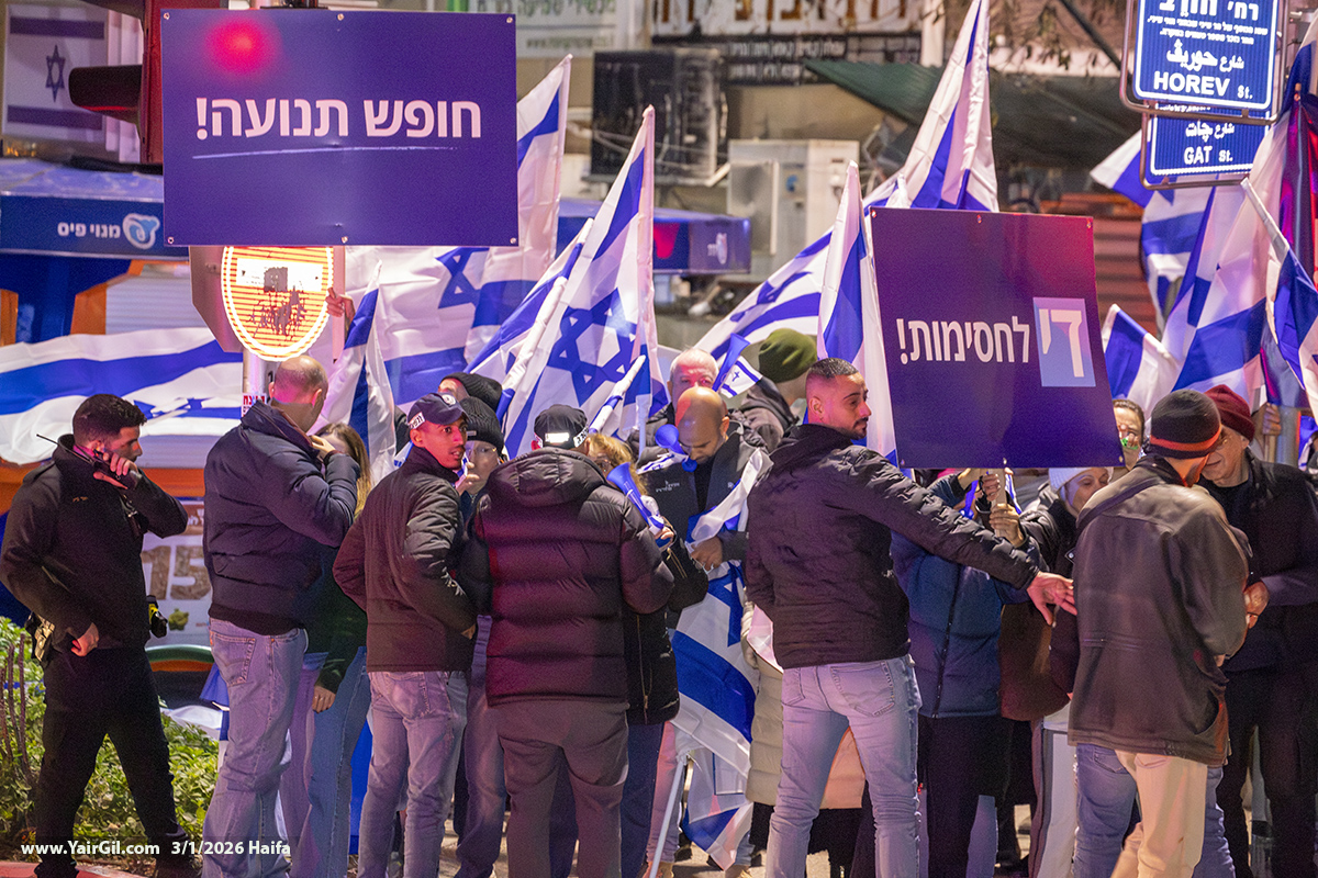 שומרים על החרדים לדמוקרטיה בהפגנה בצומת חורב בחיפה 3.1.2026 – נגד נתניהו וממשלתו, נגד ההפיכה המשטרית ובעד הקמת וועדת חקירה ממלכתית לאסון 710. – הפגנת הנגד עם כמאה משתתפים קולניים עמדה ממול.