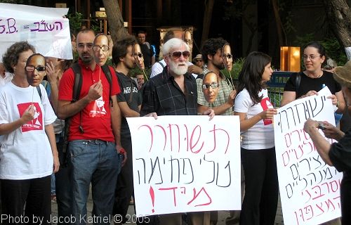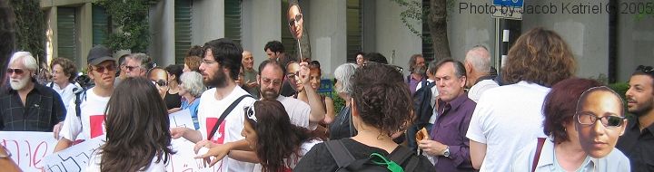 הפגנה בחזית בית המשפט המחוזי בתל-אביב בבוקר פתיחת שלב "הגשת הראיות", 17 ביולי 2005