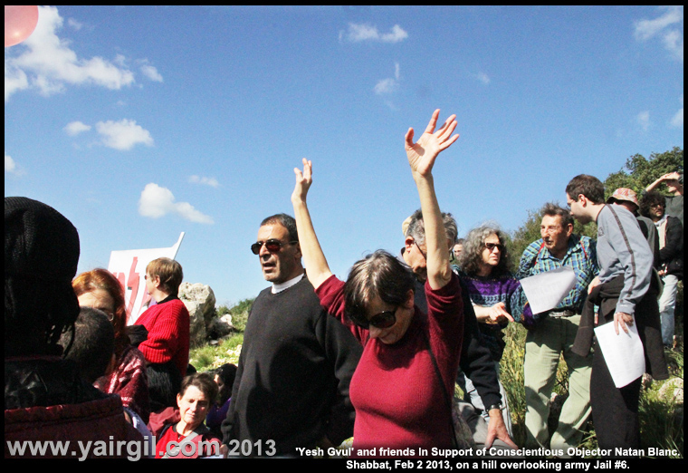 כשישים איש עלו היום 2.2.2013, שבת בצהריים על הגבעה מעל כלא שש, עתלית, להביע את תמיכתם בסרבן השירות הצבאי נתן בלנק הכלוא במצטבר מעל לשבעים ימים. את האירוע ארגנה תנועת 'יש גבול' שהוציאה אוטובוס תומכים מירושלים ותל אביב. החיפאים הגיעו עצמאית כמנהגם באירועים מעין אלה. נתן מסרב מסיבות אידאולוגיות ולא מנסה להשתמט באמצעות קב"ן או תירוצים אחרים. ד"ר ישי מנוחין הנחה את האירוע במהלכו הושמעו קריאות עידוד בנוסח "נתן כל הכבוד" ו"הסרבן הוא גיבור". נשאו דברים העתונאי גדעון ספירו שהגיע מעט באיחור מפני שהחמיץ את ההסעה: "שכרתי מכונית בכדי להגיע לכאן וטיפסתי לפה עם 77 שנותי בשביל להגיד לך כל הכבוד, טוב שיש כמוך וטוב שילכו אחריך." ג'ודי, סבתא של נתן (84), אמרה: " נתן, אנחנו כולנו גאים בך, מפני שאתה בן אדם בשל, מוסרי ופוליטי". שרו שירים וקראו שוב ושוב את הסיסמאות המוכרות, והקהל התפזר תוך הבטחה להגיע שוב בכוחות מתוגברים במידת הצורך, בחודש הבא. |