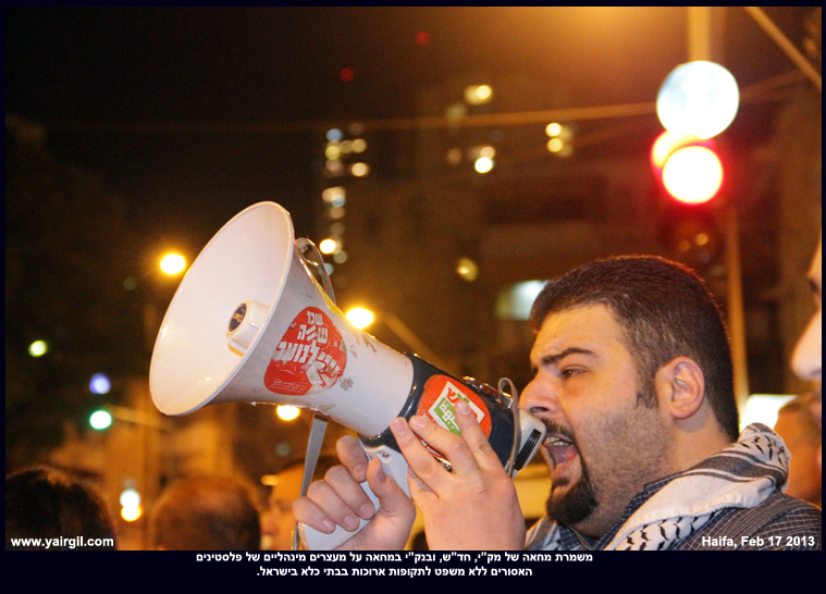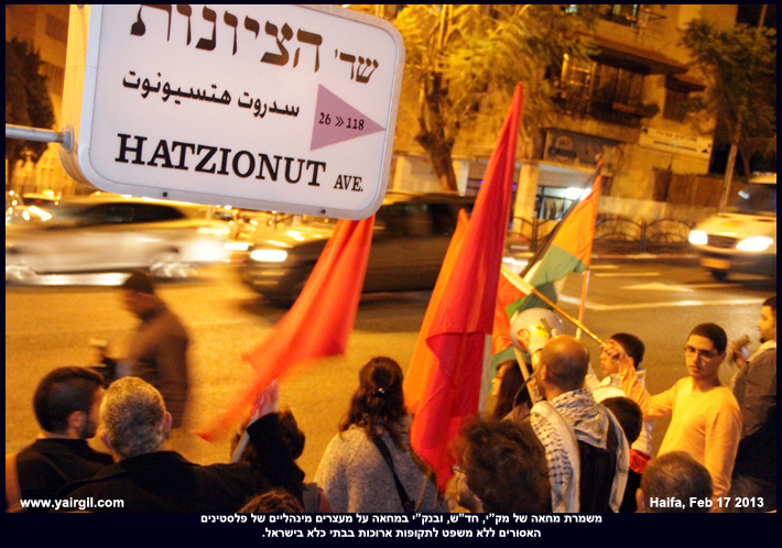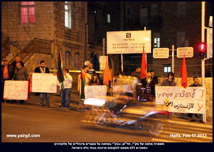 משמרת מחאה של בנק"י חד"ש ומק"י בתביעה להפסקת מעצרים מינהליים של פלסטינים המוחזקים בבתי כלא בישראל ללא משפט, לתקופות ממושכות. חיפה, 17.2.2013. - צילום יאיר גיל