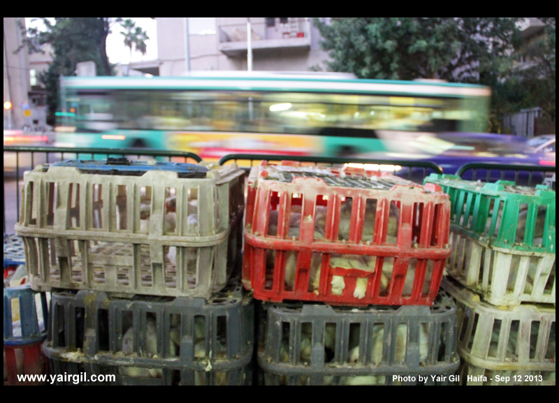 רחוב ארלוזורוב פינת גאולה, ליד המקווה. תרנגולים ותרנגולות לסיבובים בעיר הגדולה. |