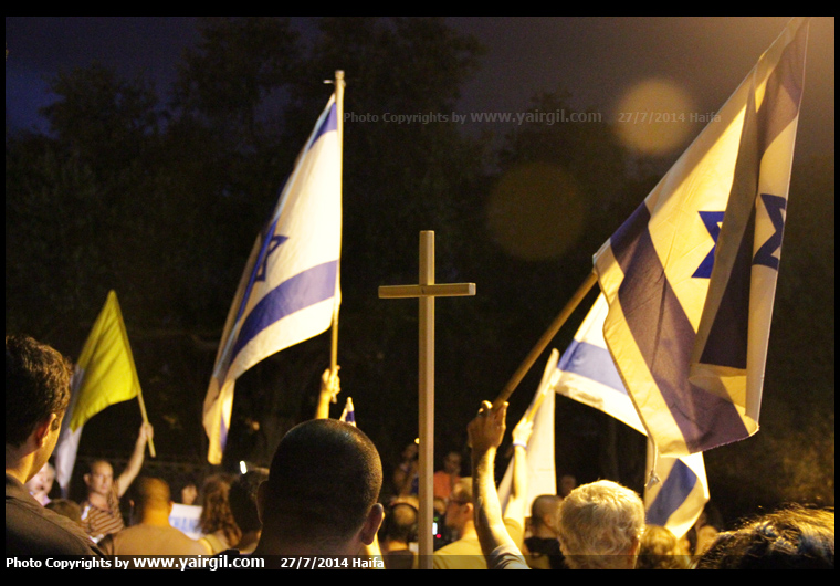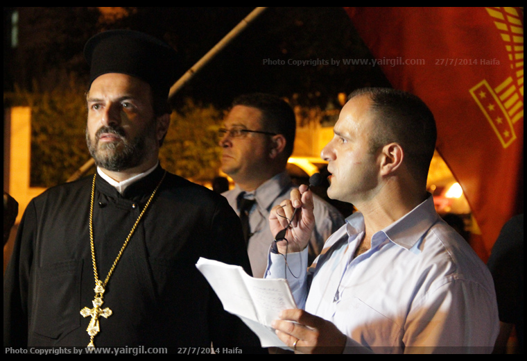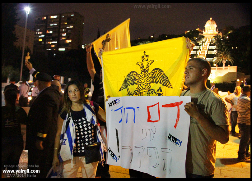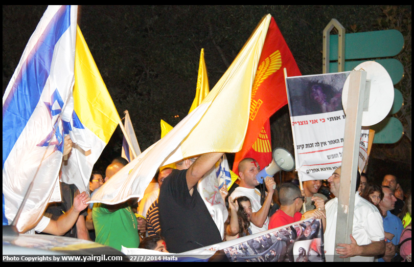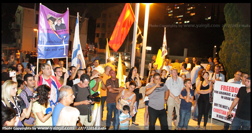 הפגנה של נוצרים וארמים (Aramaic) לטובת צה"ל, מדינת ישראל ומדיניותה כלפי חמאס בעזה. הכומר האב גבריאל נדאף הביע הזדהות עם בני עדתו בסוריה ובארצות ערב אחרות הנרמסים, נהרגים, מדוכאים ונרדפים באשר הם, והעלה על נס את היחס הטוב שהעדה מקבלת בישראל. עשרות המפגינים נשאו את דגלי הוותיקן את הדגל הארמי, ואת דגלי ישראל, צידדו בהמשך המאבק בחמאס, הזהירו מפני כניסת דאעש לעזה, קראו לגיוס בני העדה לצה"ל. על פי המדבקות על המגפונים ובמקומות אחרים האירוע נערך בתמיכת "אם תרצו". 27.7.2014, חיפה. צילום יאיר גיל Freedom for ARAMAIC and CHRISTIAN in Arab World Why the West and the UN do not stop Christian Persecution in the Islamic World? Stop Christian Ethnic Cleansing in Arab Countries and Syria! |