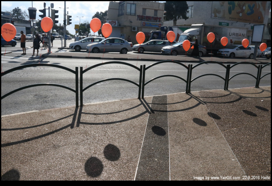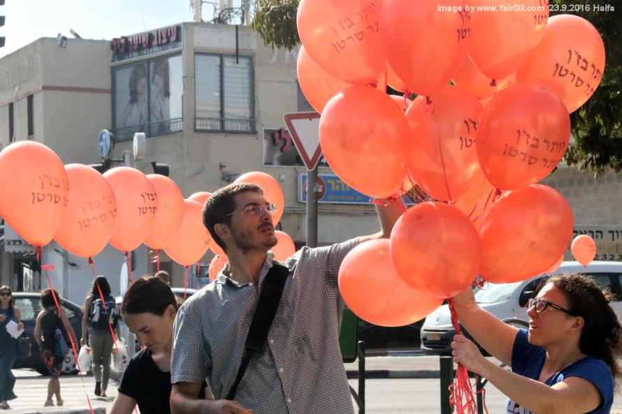 ירוקה' חילקו בלונים עם הכיתוב "יותר בז"ן יותר סרטן" לחולפים במרכז זיו בחיפה (שישי 23.9.20167).