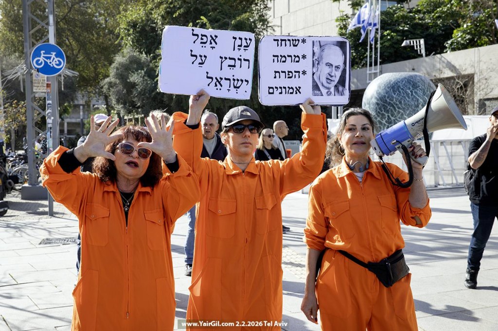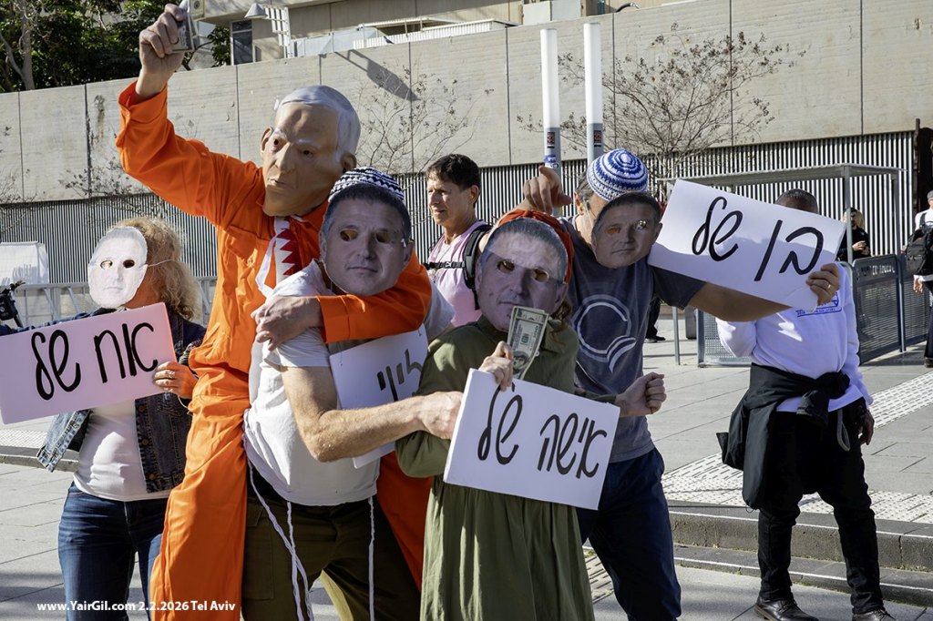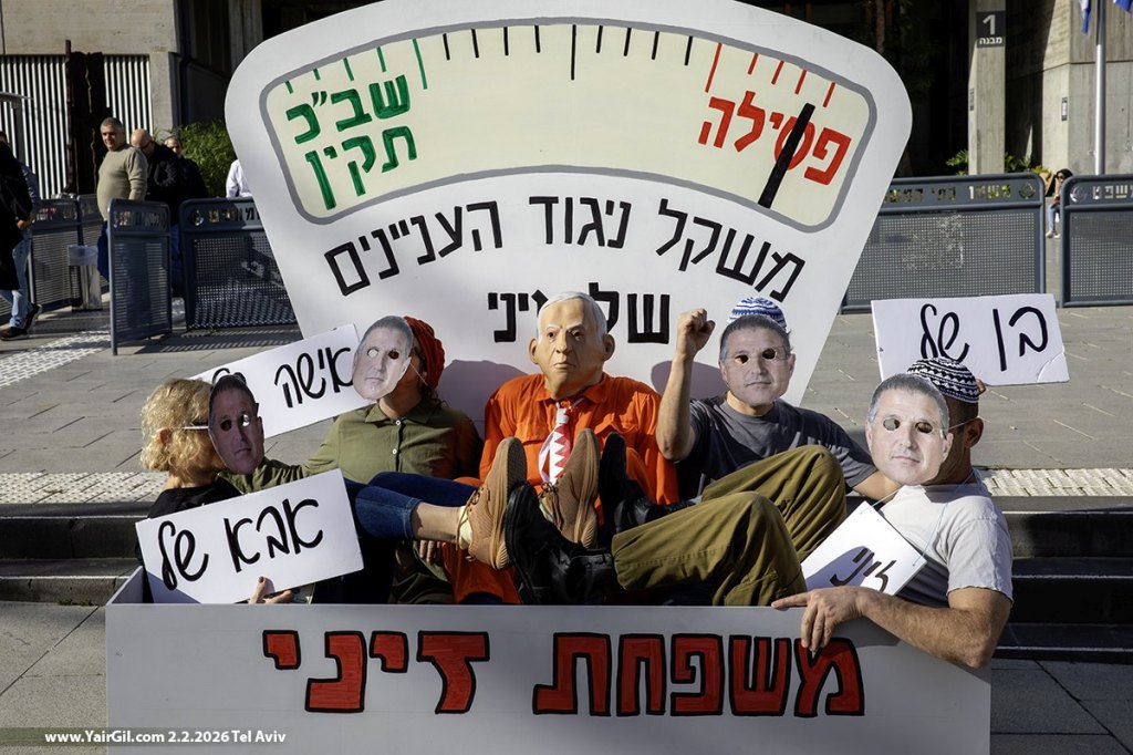 מול בית המשפט המחוזי בתל אביב 2.2.2026, מיצג לכבוד הגעת ראש הממשלה נתניהו, הנאשם בפלילים, אל עוד יום דיונים במשפטו