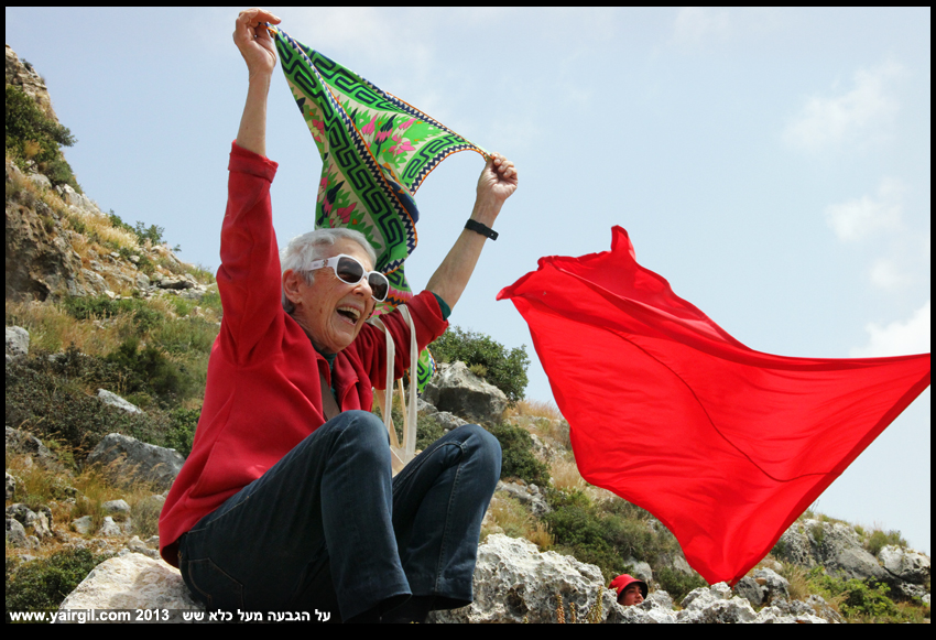 על הגבעה מעל כלא שש; ג'ודי בלנק, סבתא של נתן בלנק מנופפת לנכדה הכלוא בשל סירובו להתגייס לצבא. אביב 2013.