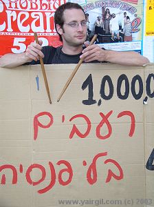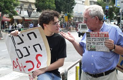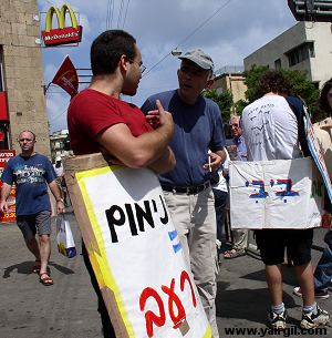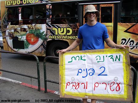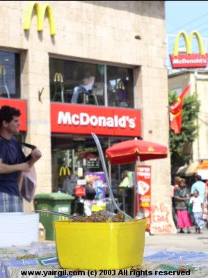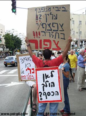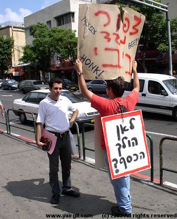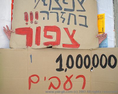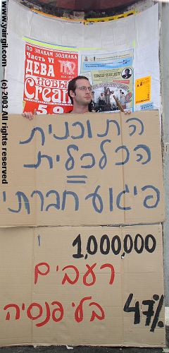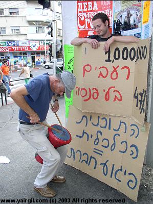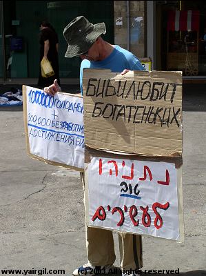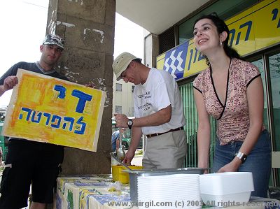 חלוקת מזון וביגוד לנזקקים. הפגנה נגד המצב הכלכלי. חיפה, בית הקרנות בחיפה 5.9.2003