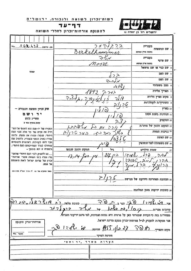 תהילה טלקה פייג משה ברקלהמר (דף עדות אודותם)