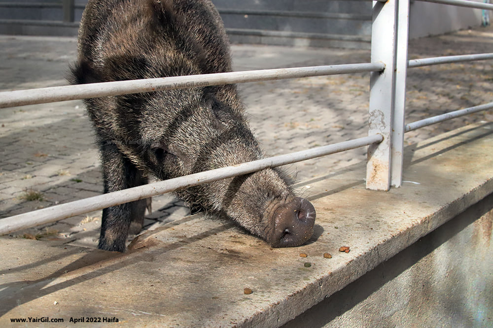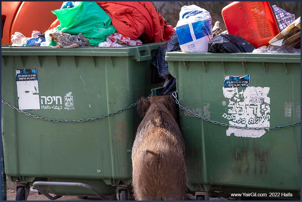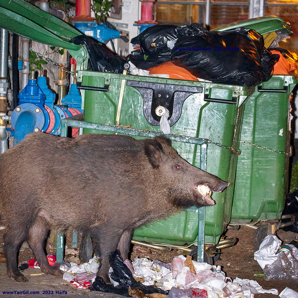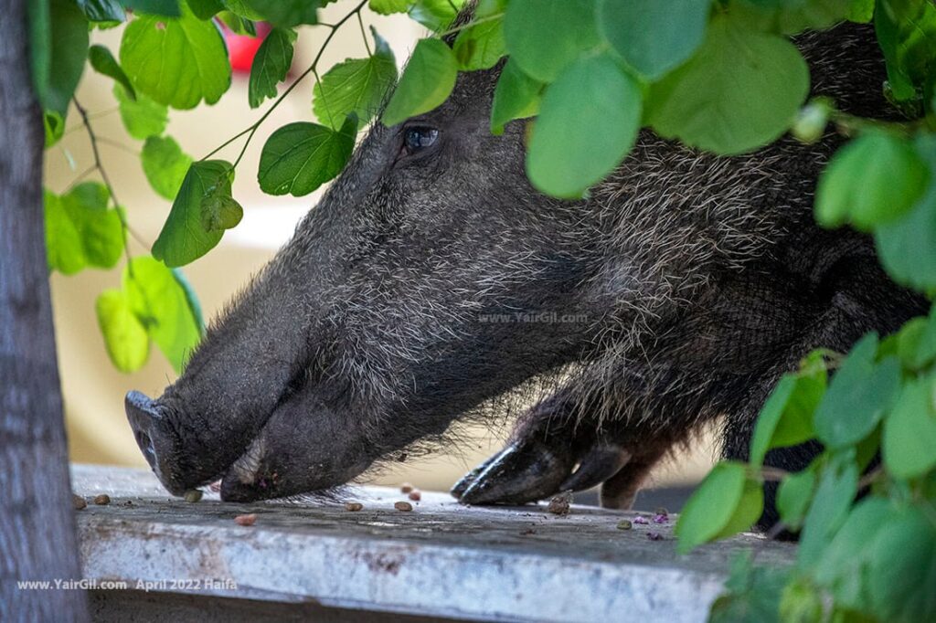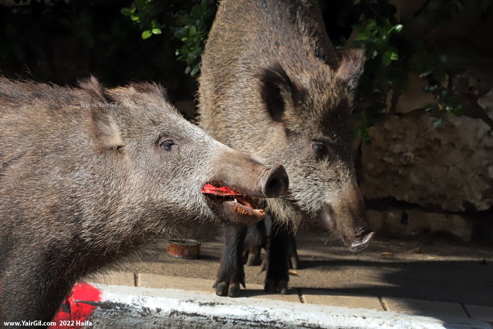 חזיר בר שואב לפיו מזון חתולים. חיפה 2022