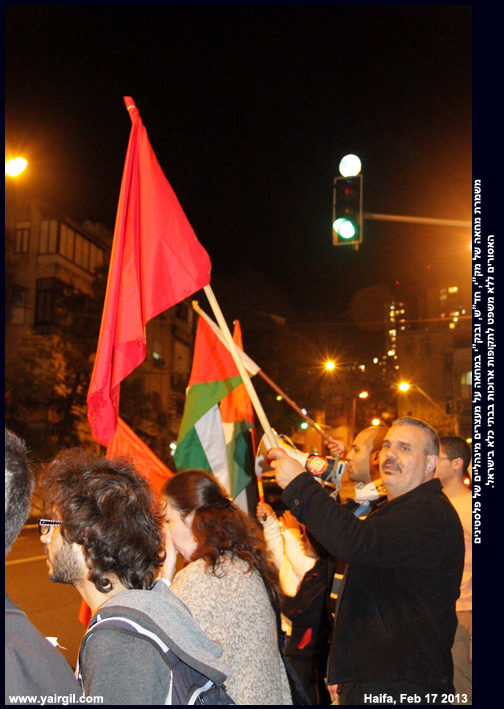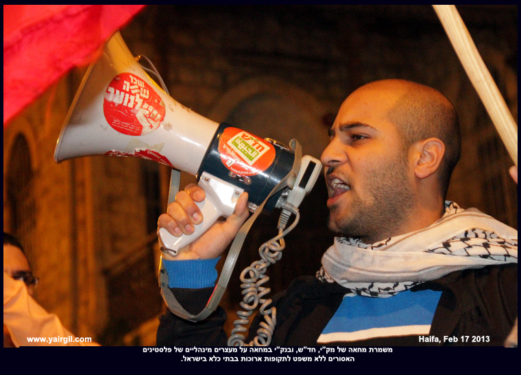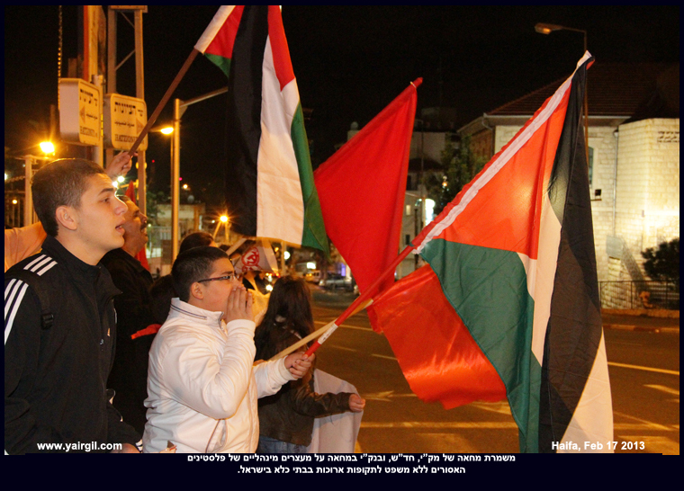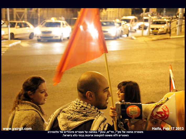 משמרת מחאה של בנק"י חד"ש ומק"י בתביעה להפסקת מעצרים מינהליים של פלסטינים המוחזקים בבתי כלא בישראל ללא משפט, לתקופות ממושכות. חיפה, 17.2.2013. - צילום יאיר גיל